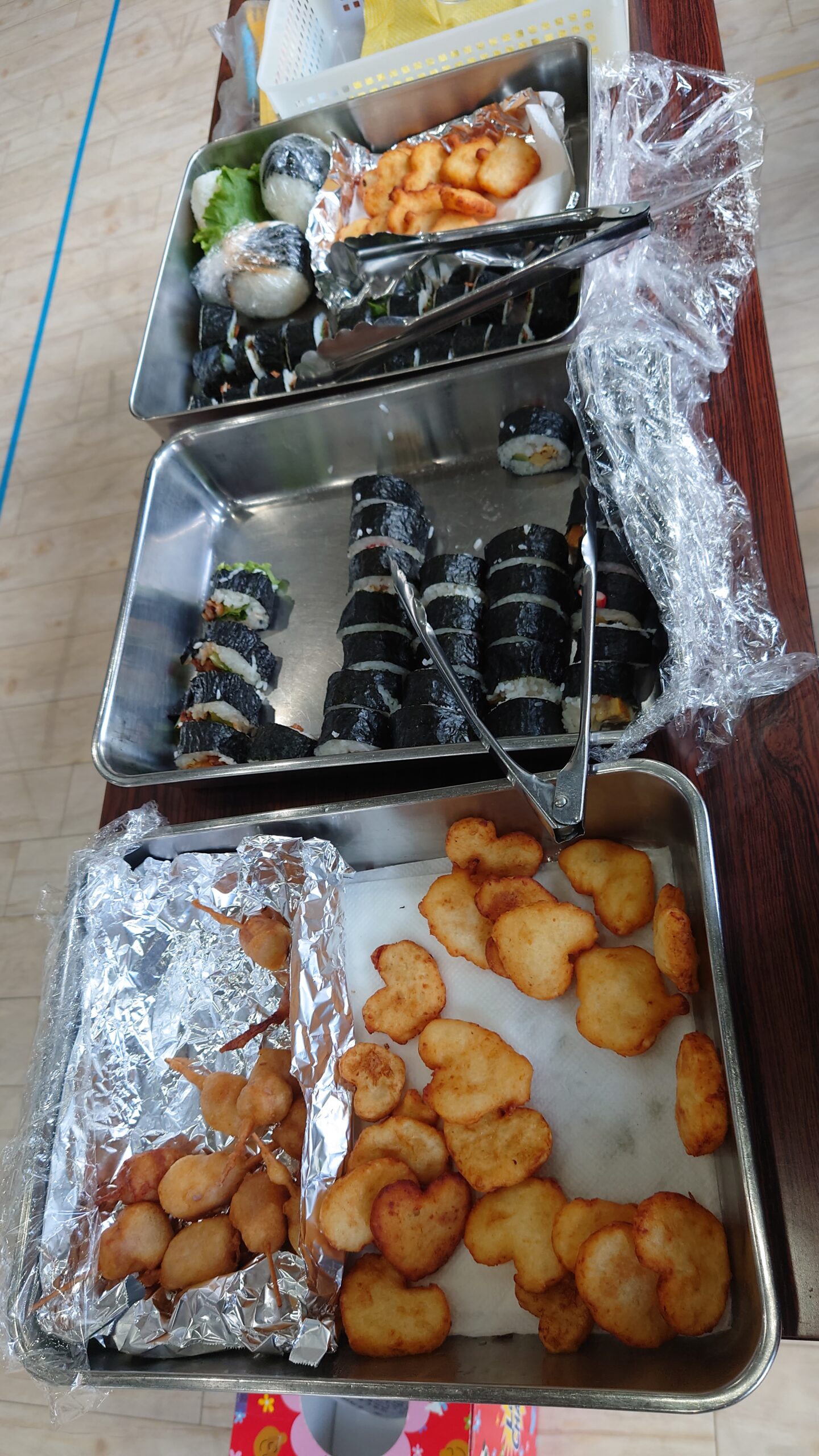 みんなで食べる『流しそうめん・星形ポテト・ミニアメリカンドッグ・サラダ巻き・プルコギ巻き・七夕ゼリー』を高学年が調理をしてくれました☆