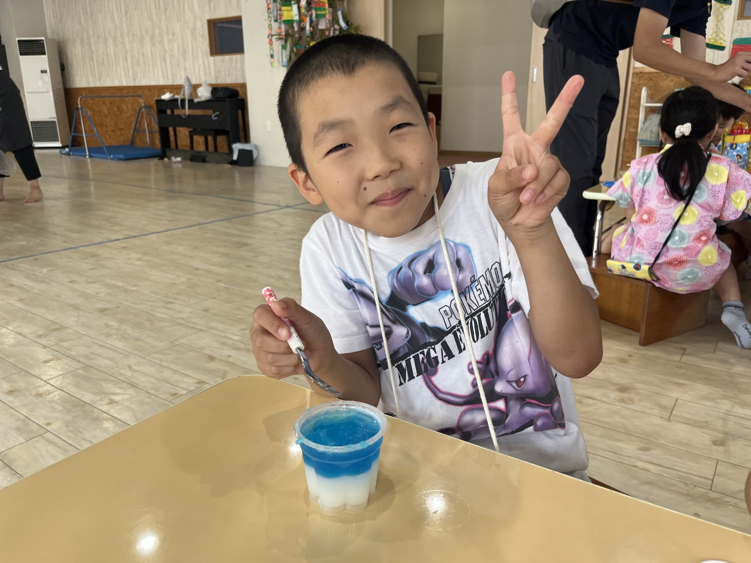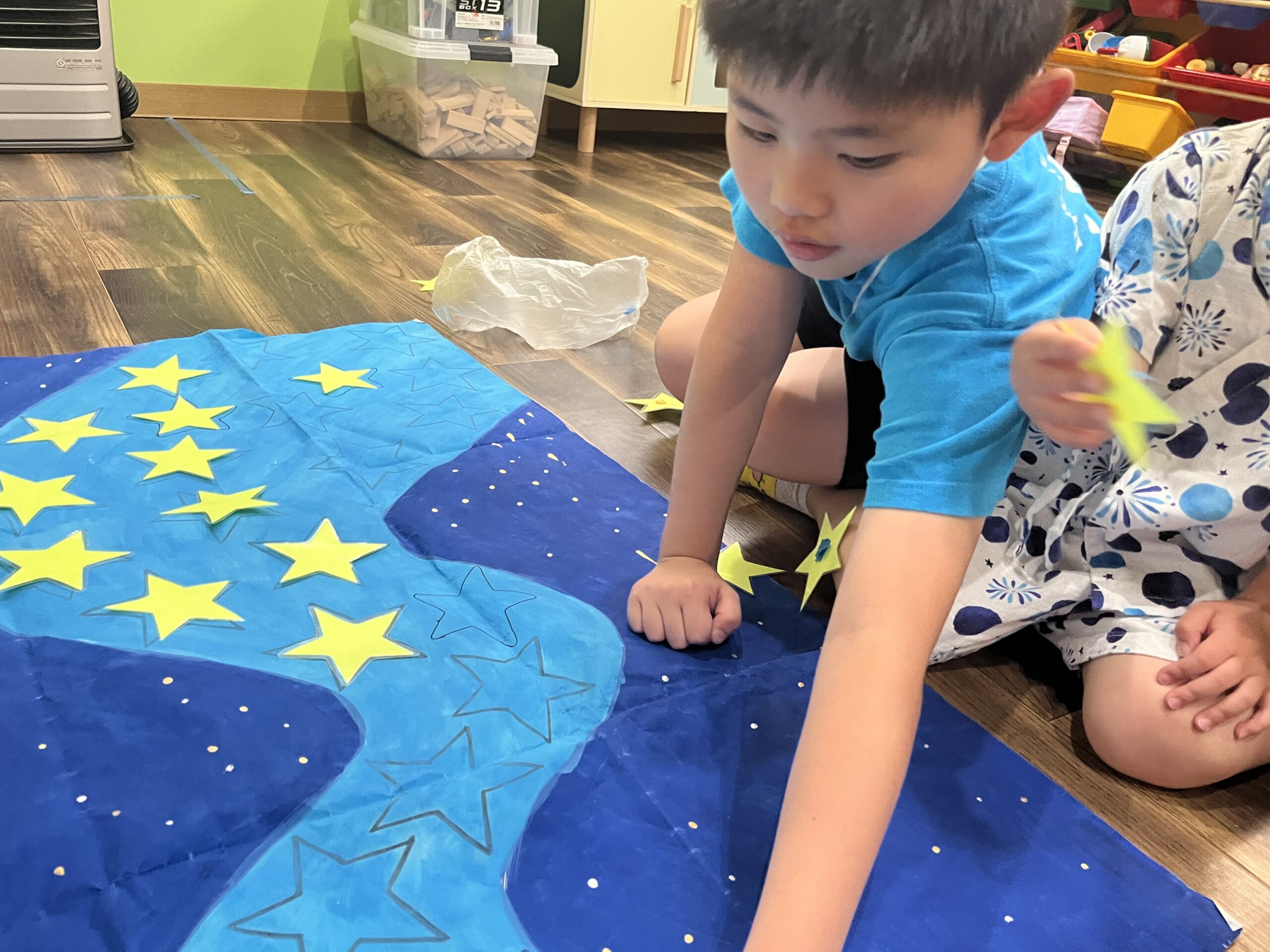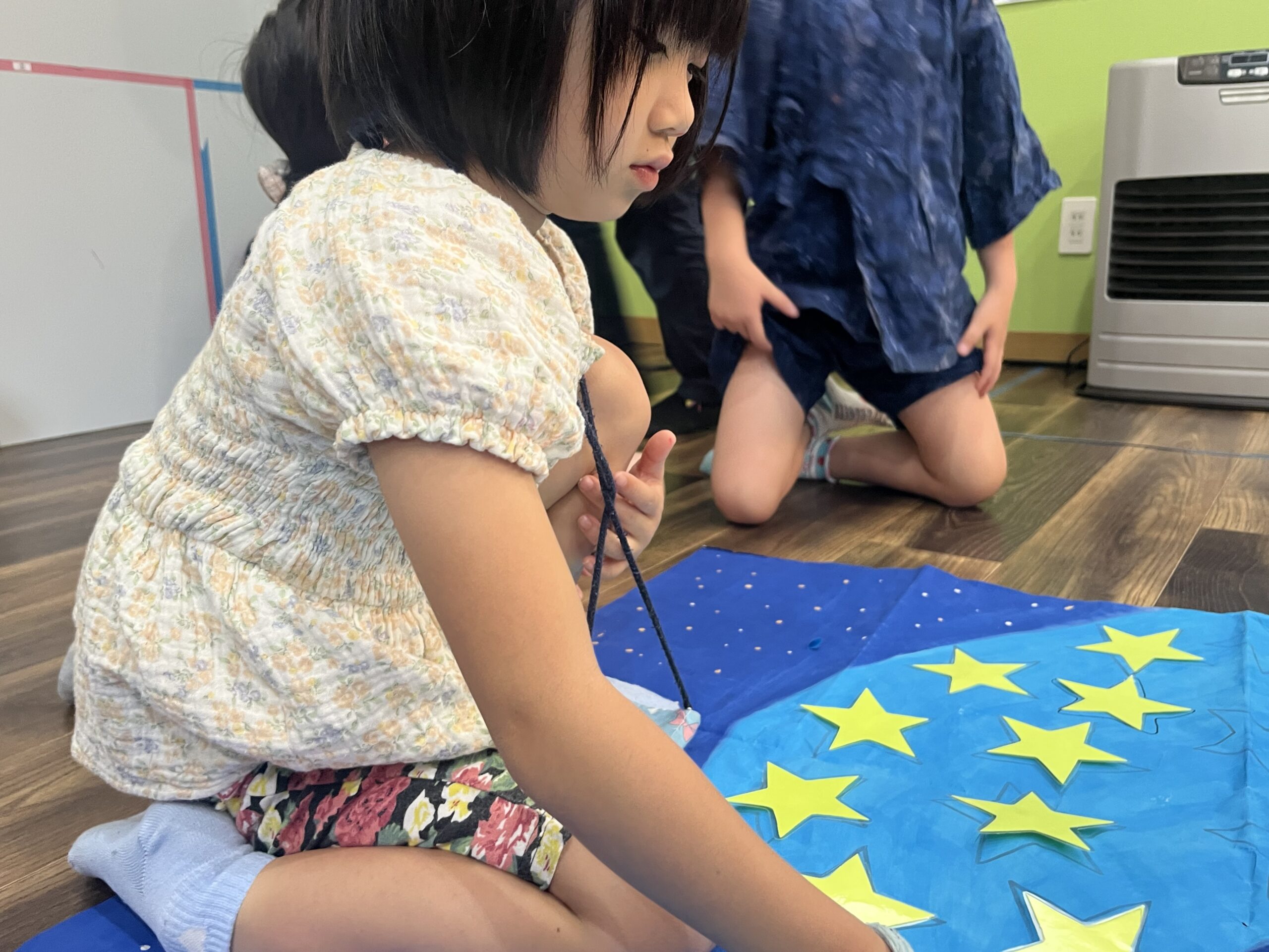 キーホルダーを作った後は、七夕の由来をペープサートで見てから、天の川の星集めゲームを、おりひめ(女の子)チームとひこぼし(男の子)チームに分かれて行いました☆