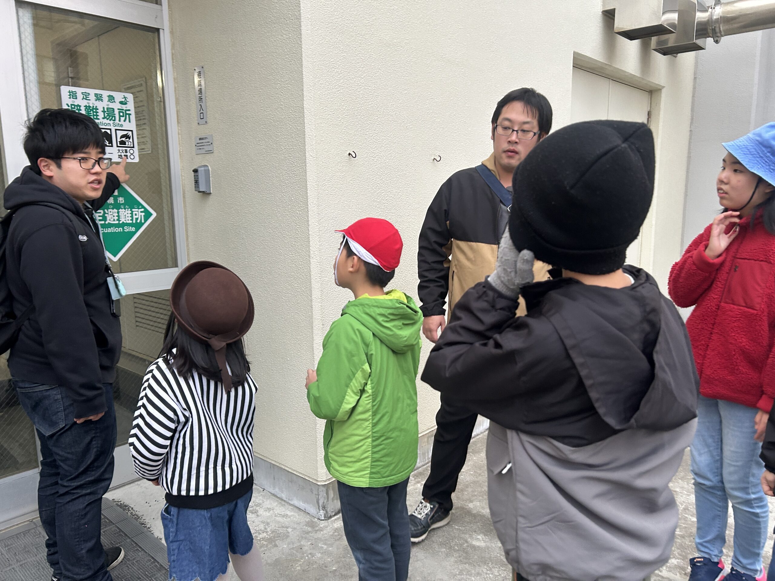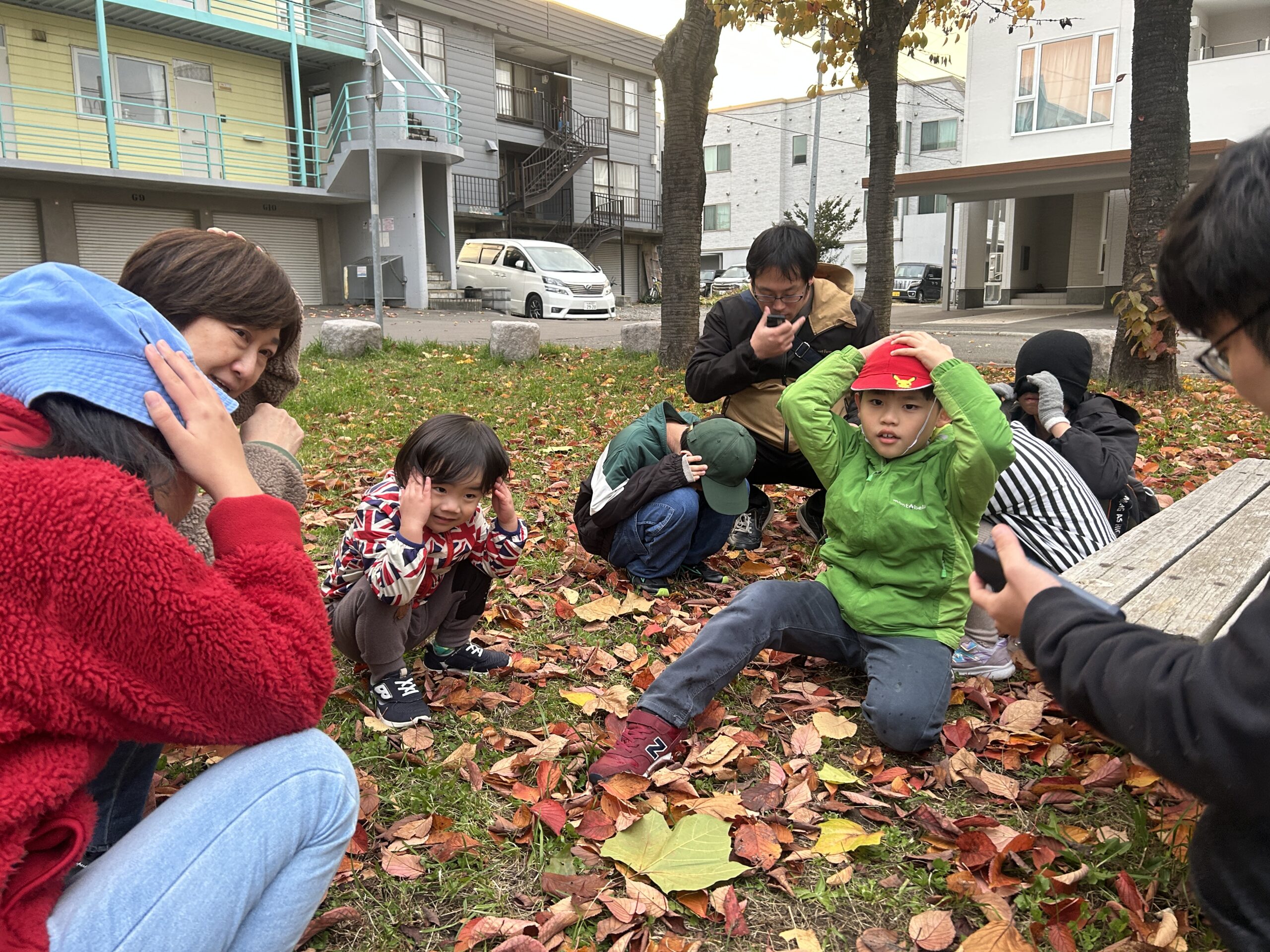 公園で遊んでいる時に地震がきた想定でみんなでしゃがんで、身を守ります。