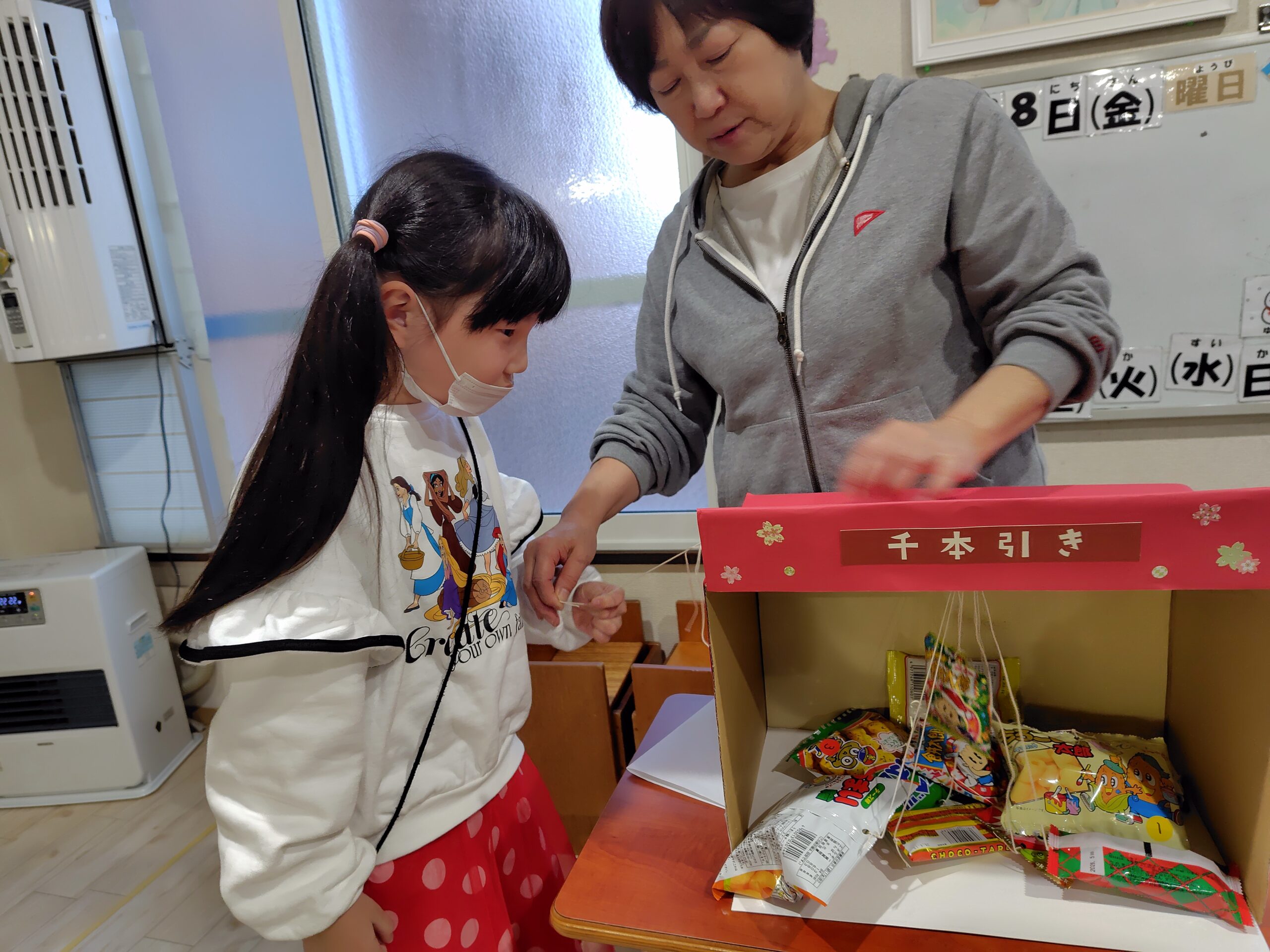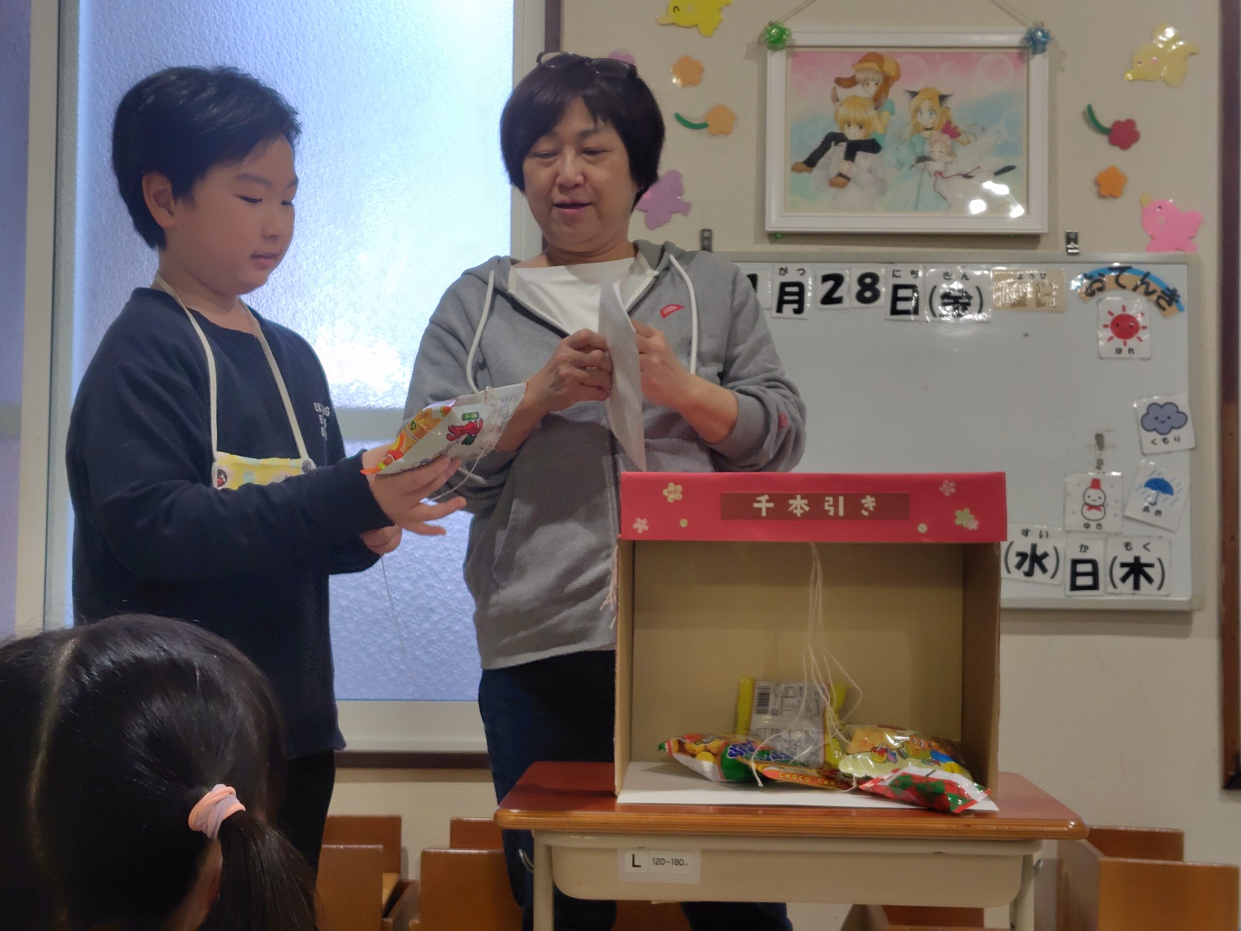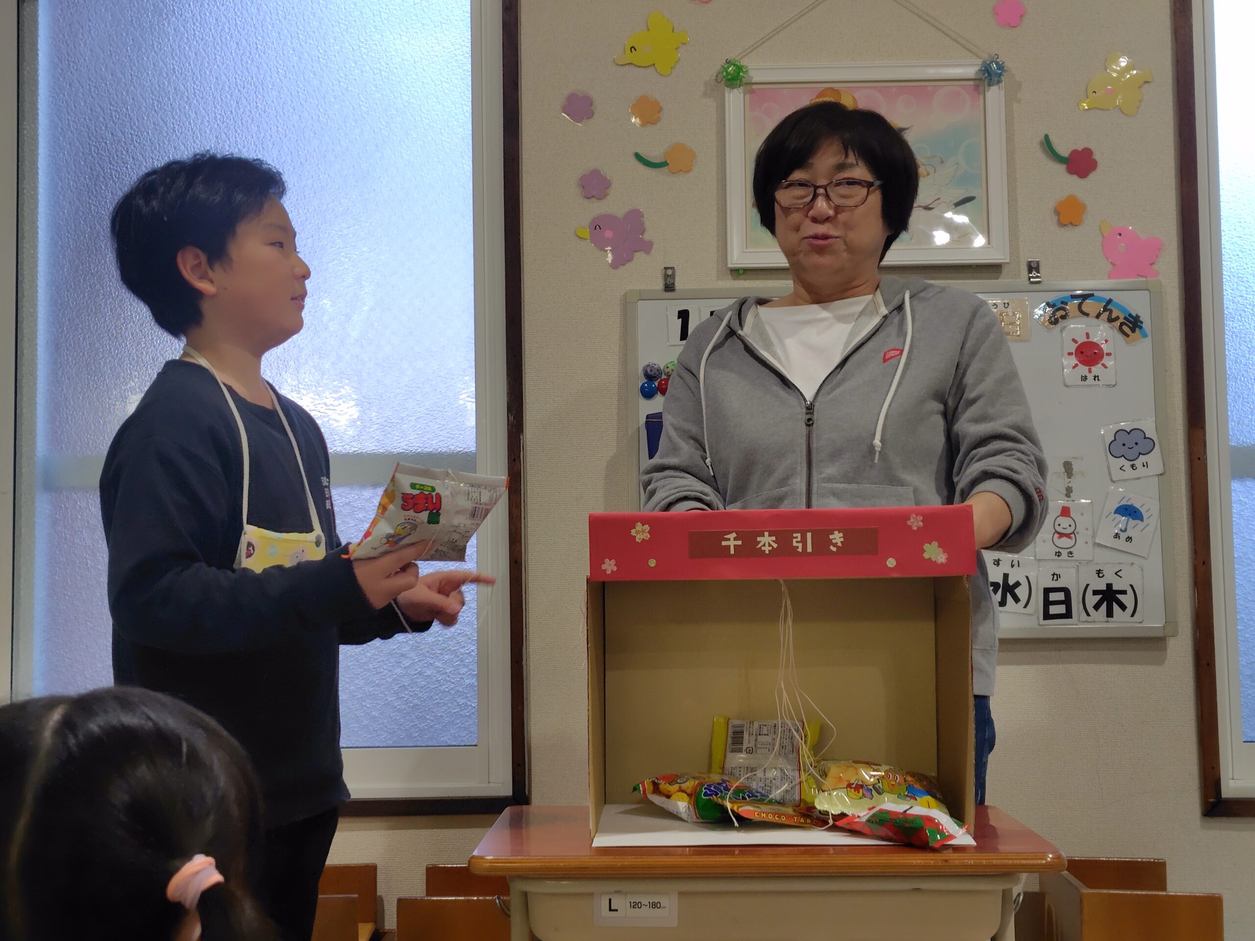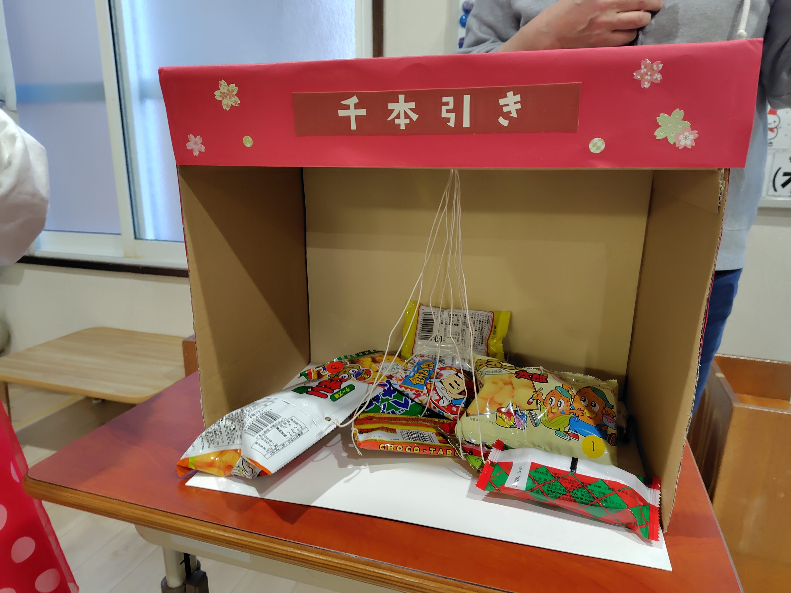 千本引きをして、お菓子に書いてある番号の質問に答えられるとお菓子をゲット!