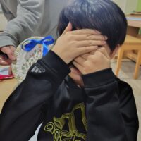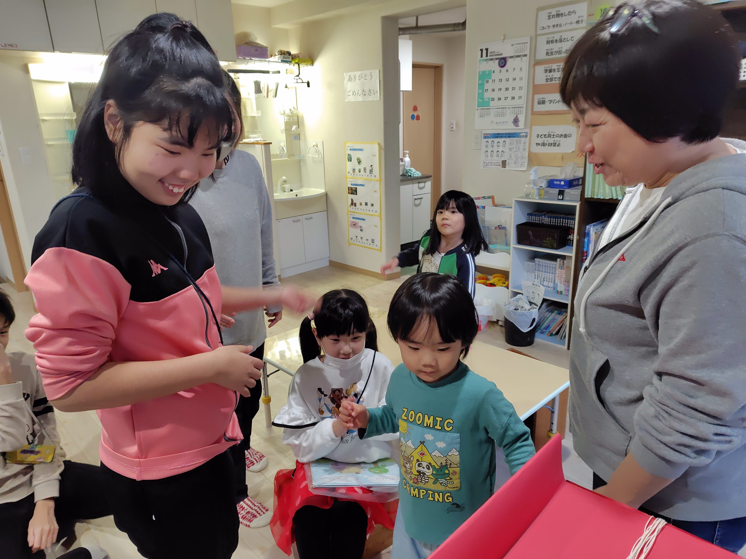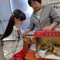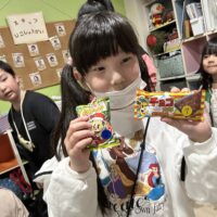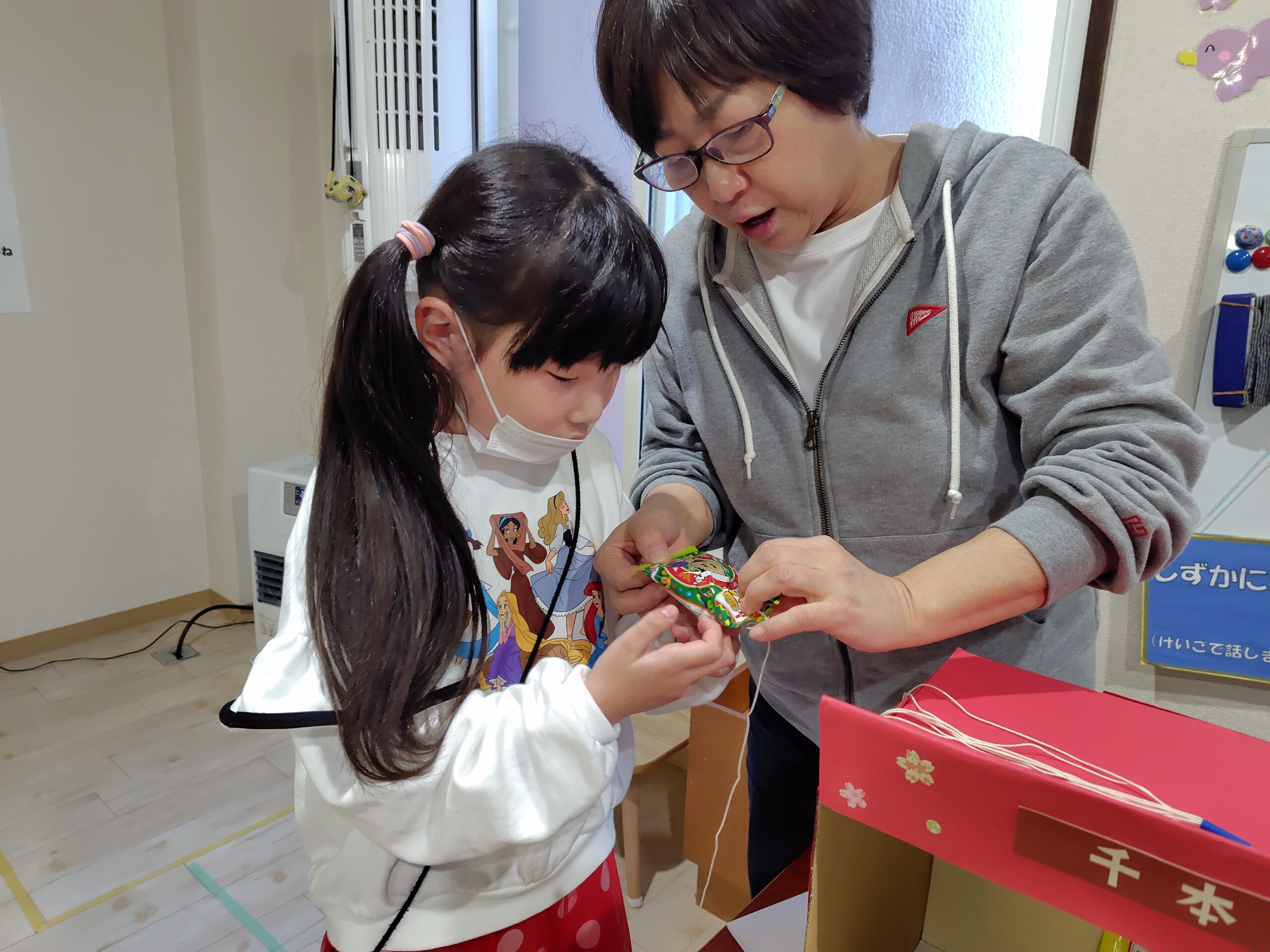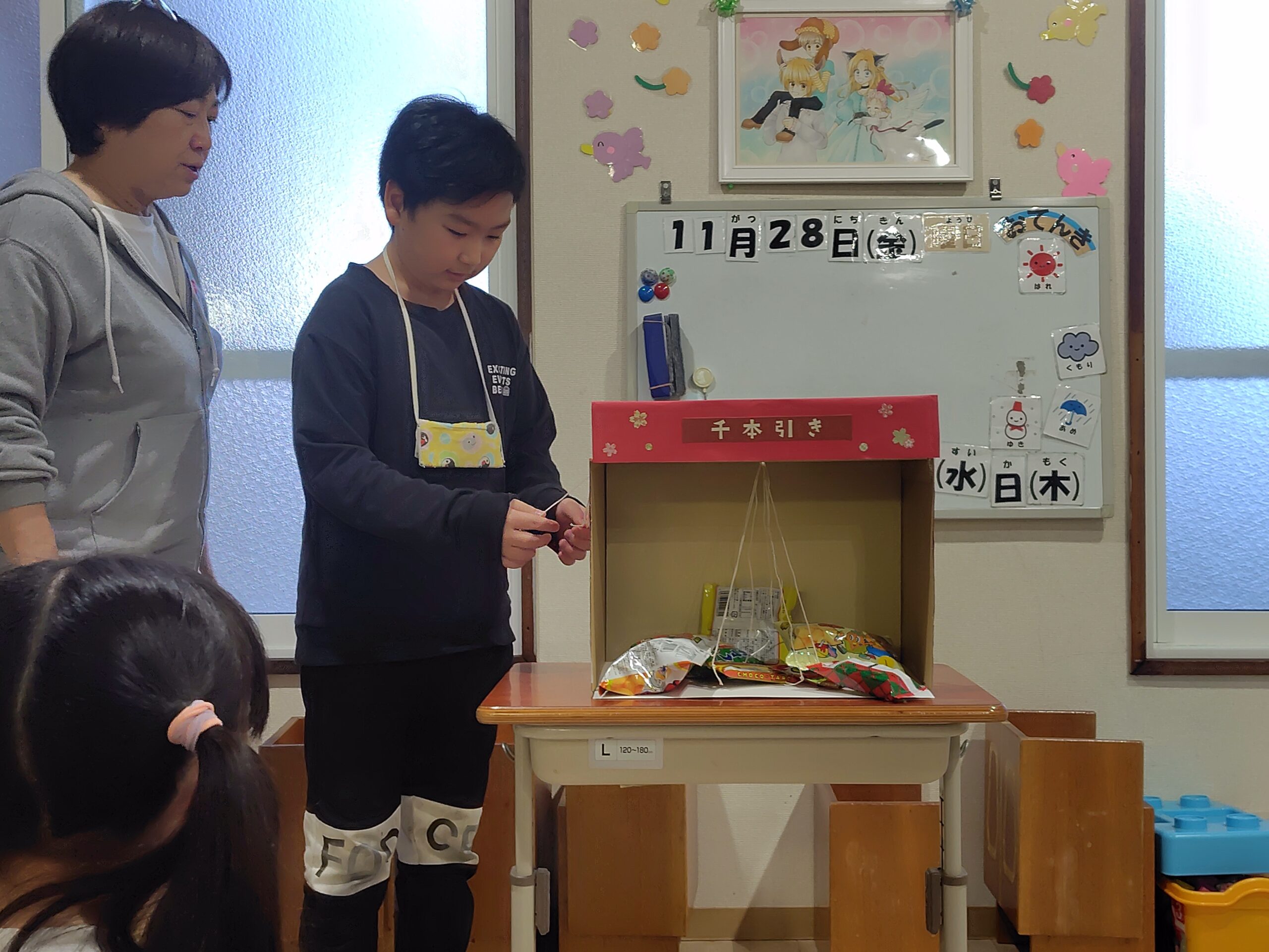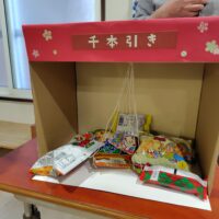 千本引きをして、お菓子に書いてある番号の質問に答えられるとお菓子をゲット!