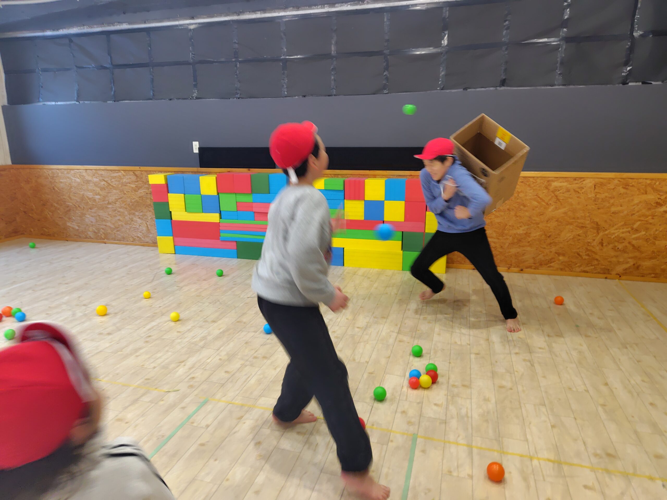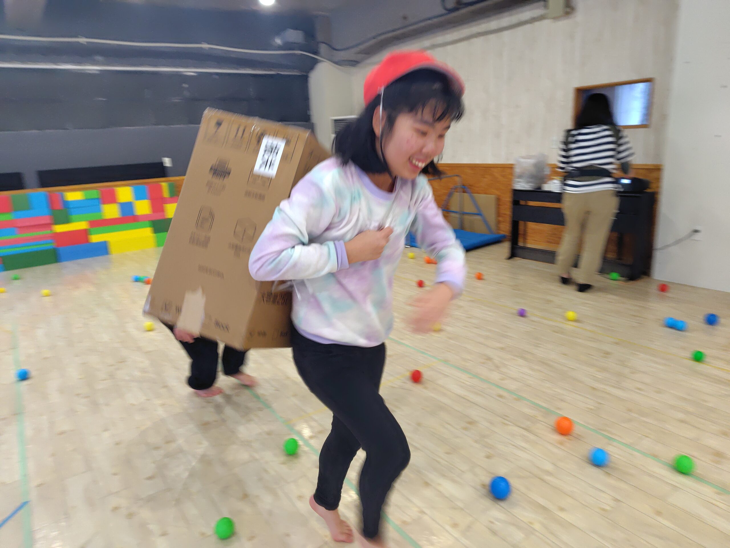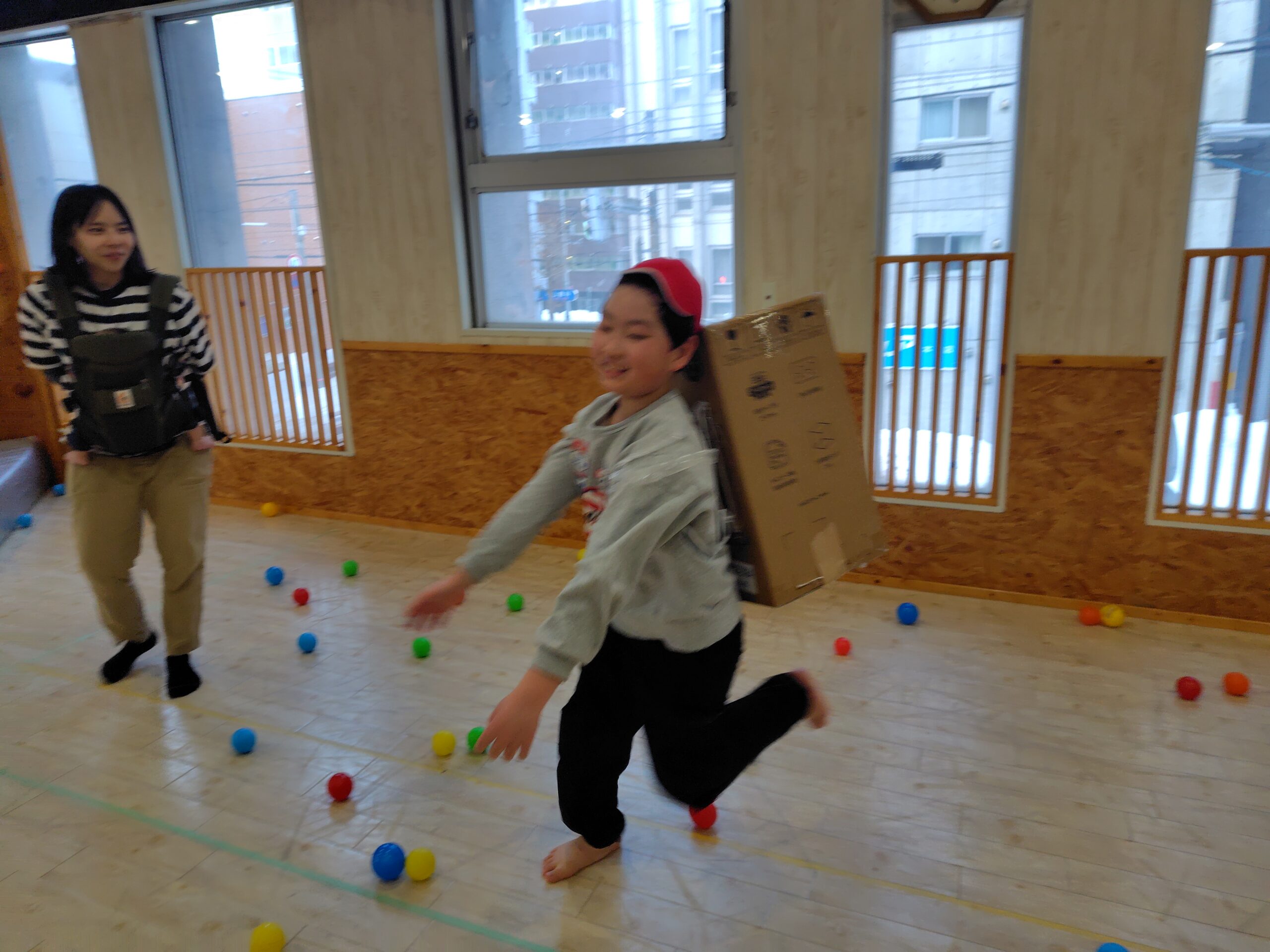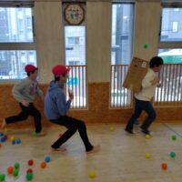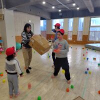 食べた後は、節分ゲームをし、段ボールを背負い、豆に見立てたボールから逃げるゲームをしました。
