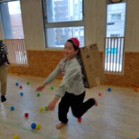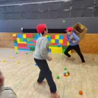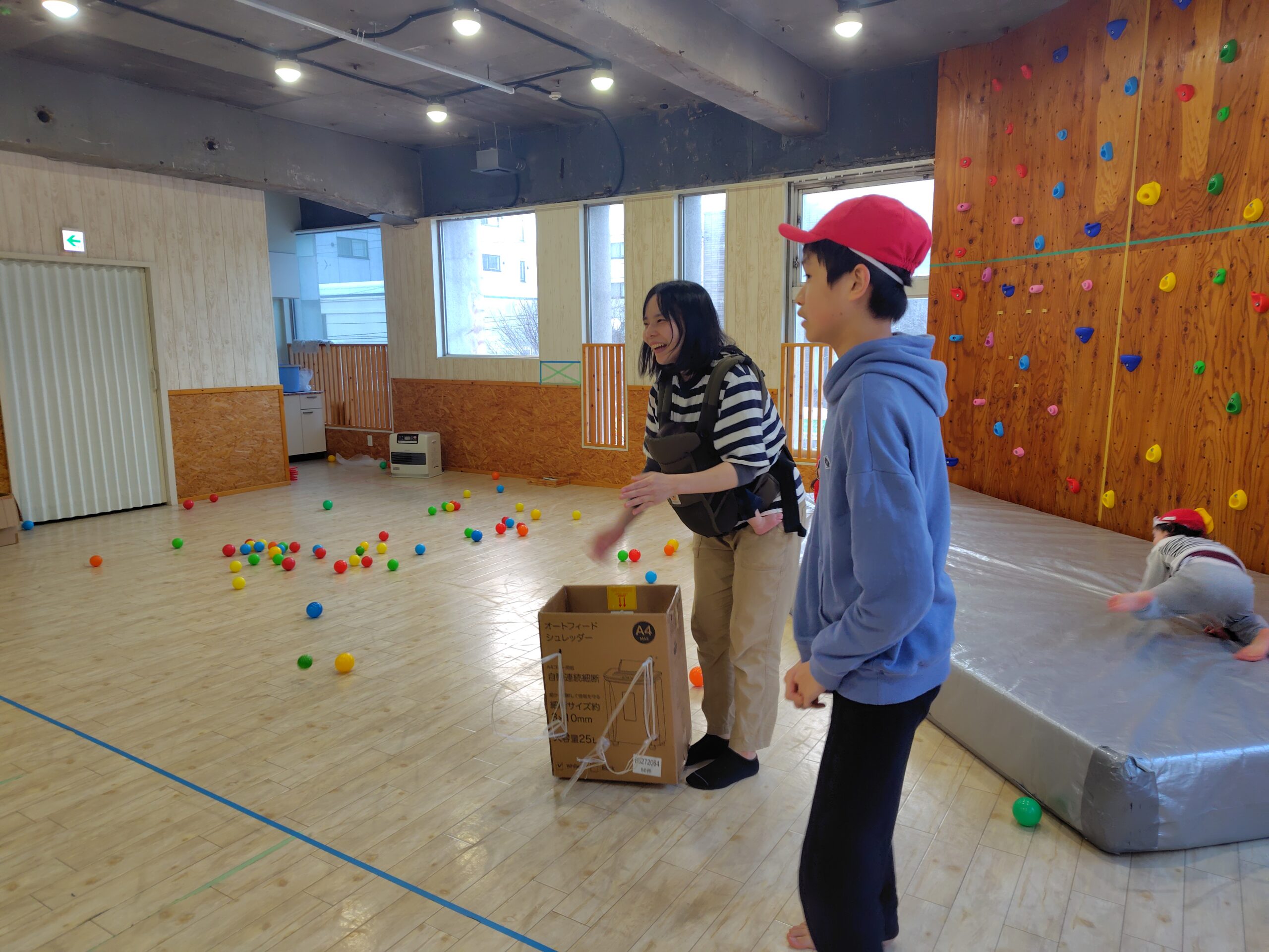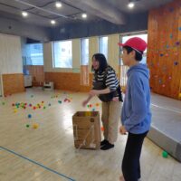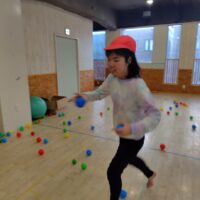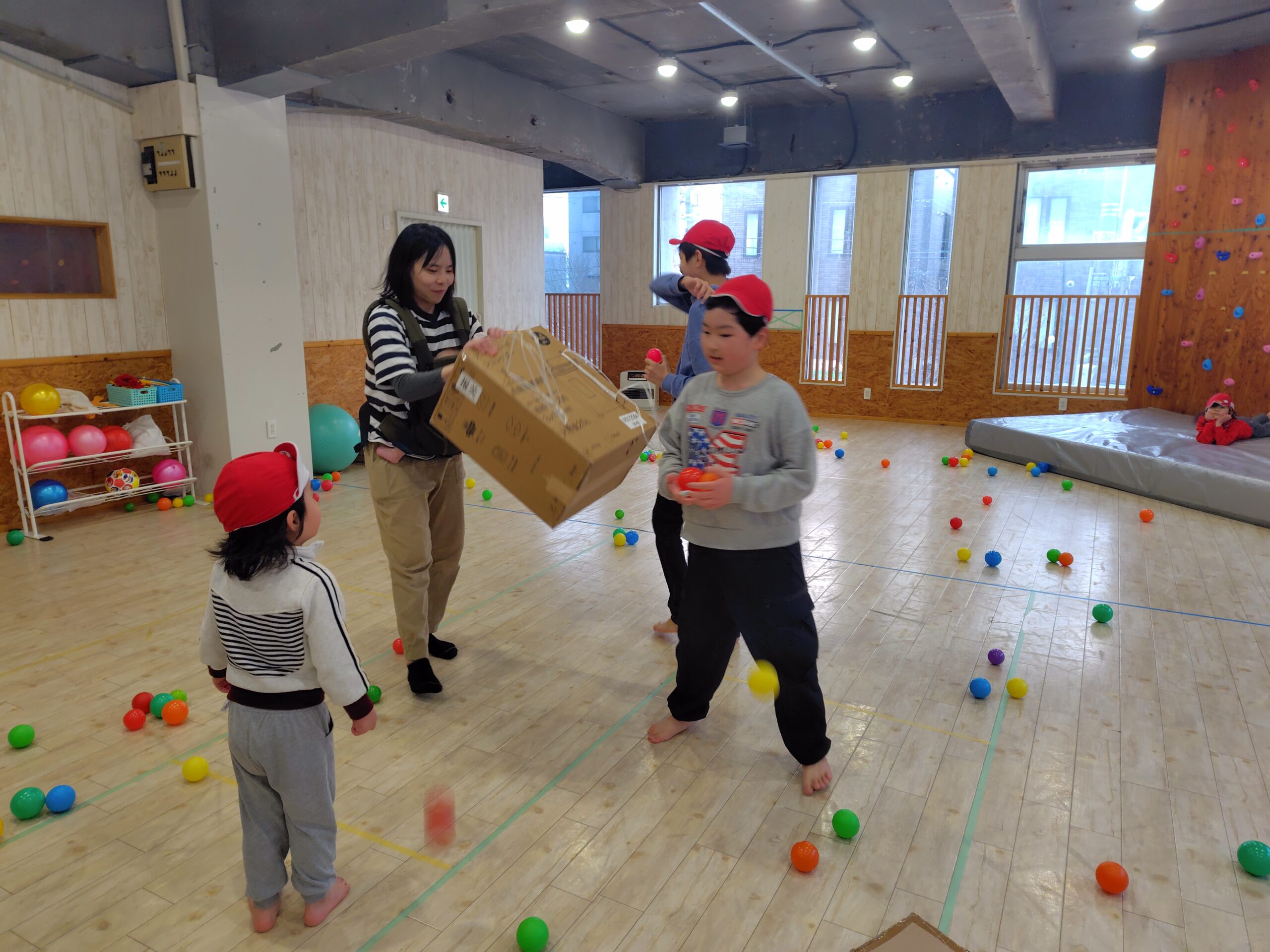 食べた後は、節分ゲームをし、段ボールを背負い、豆に見立てたボールから逃げるゲームをしました。