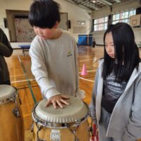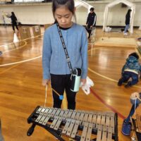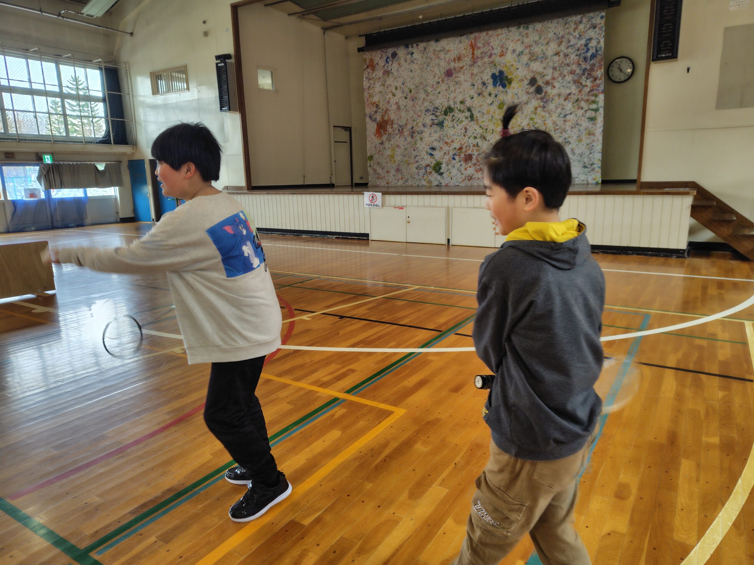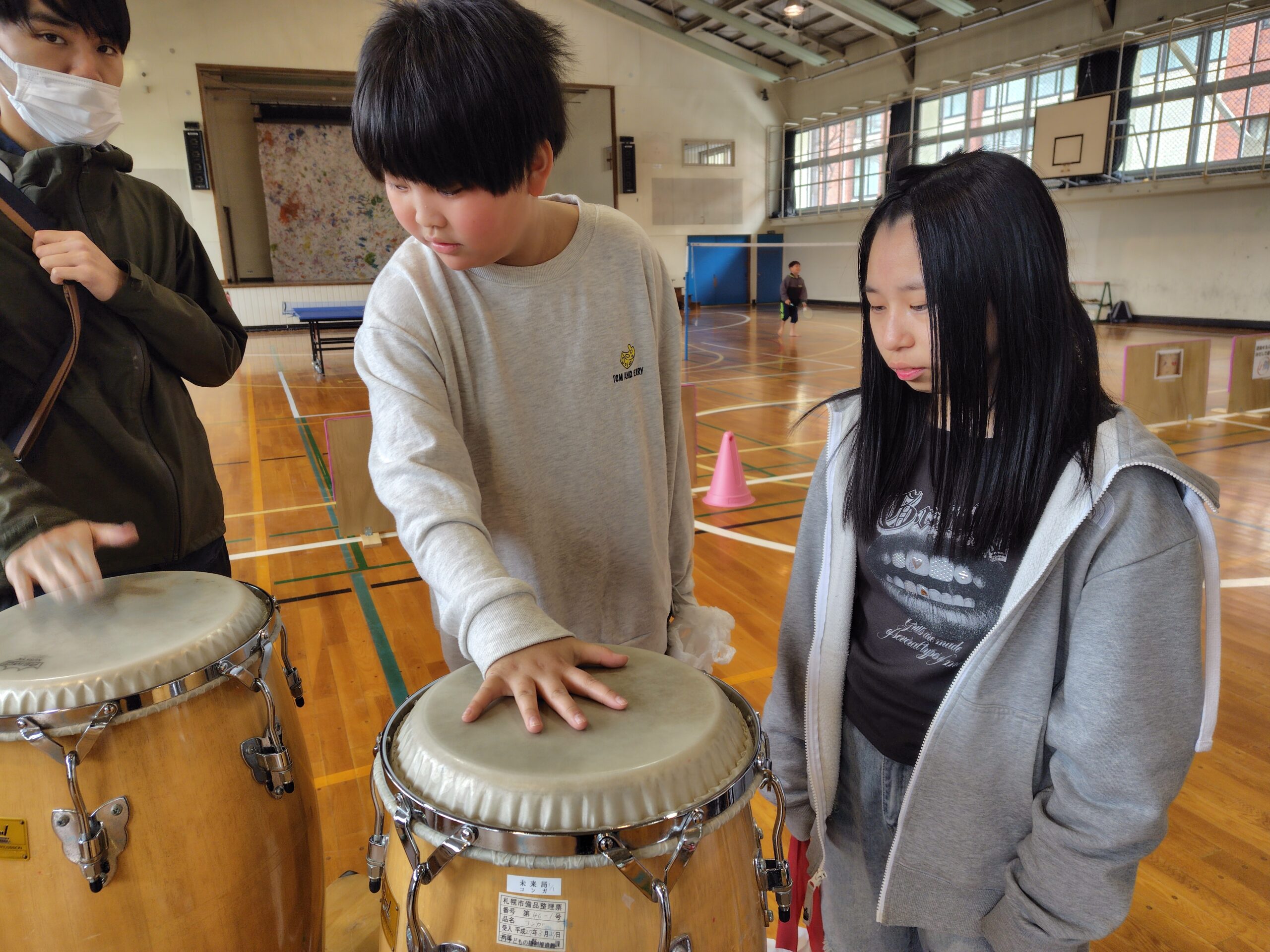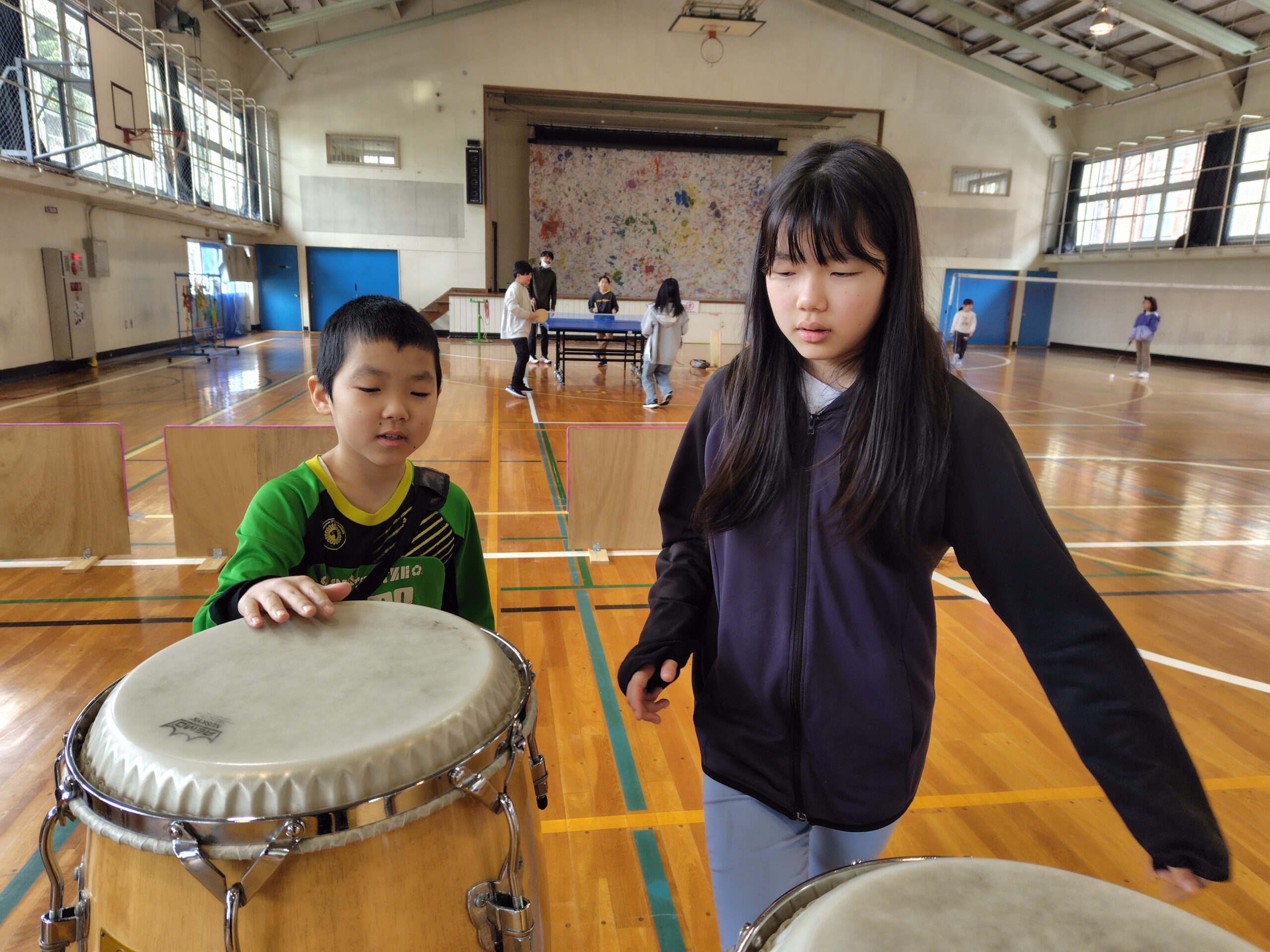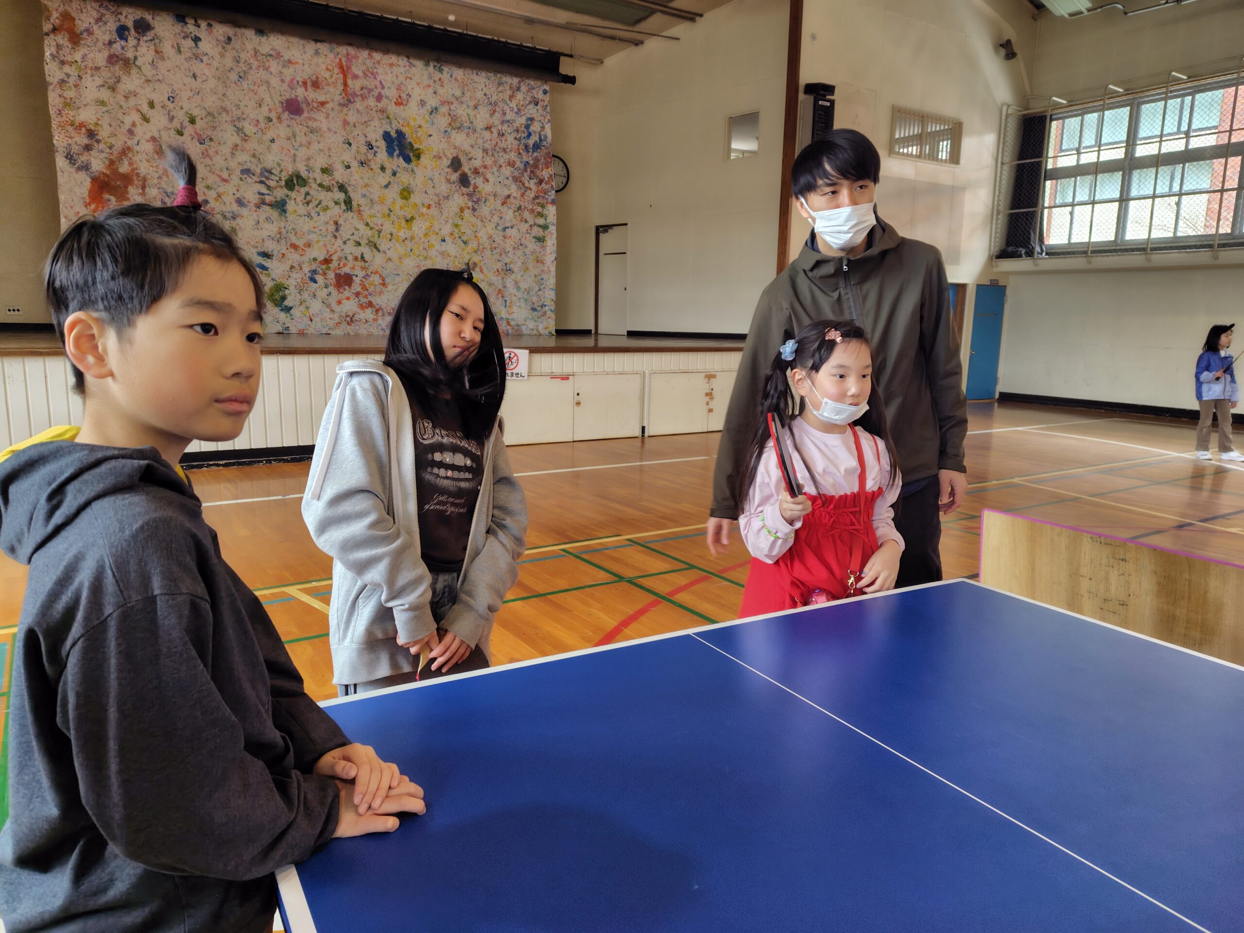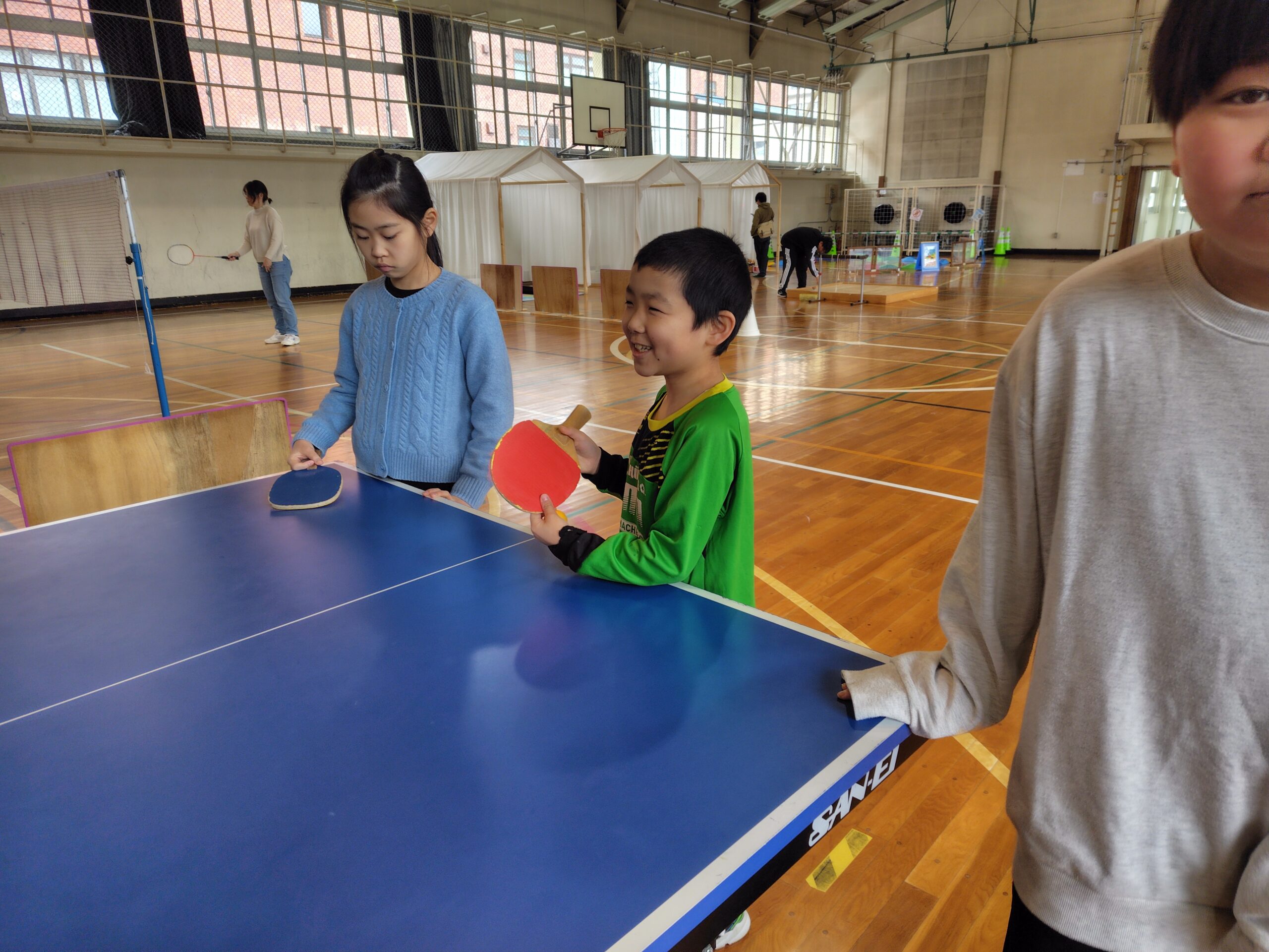 体育館でバトミントンや卓球、楽器を触ったり、