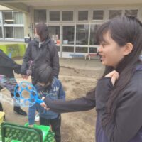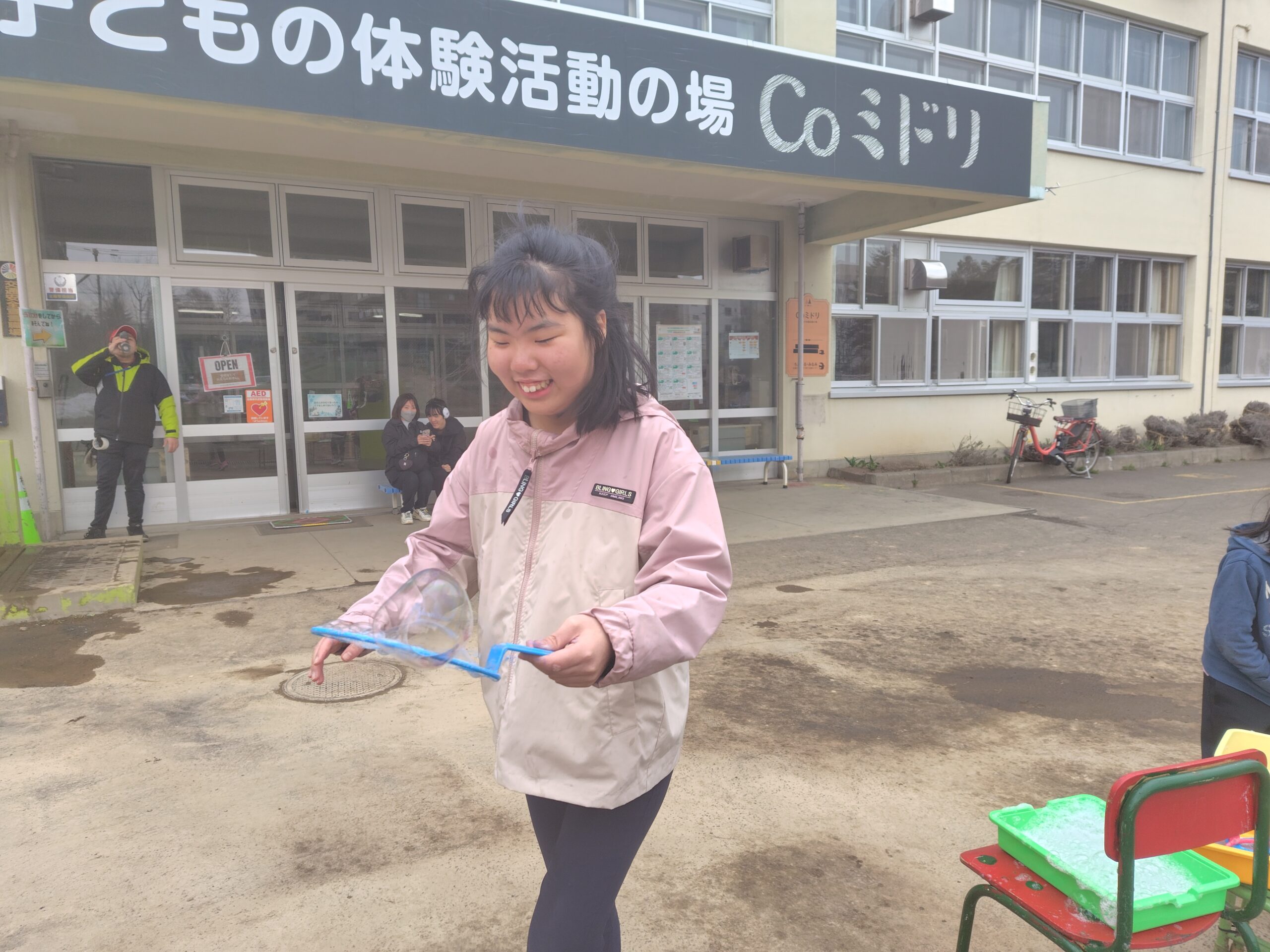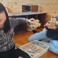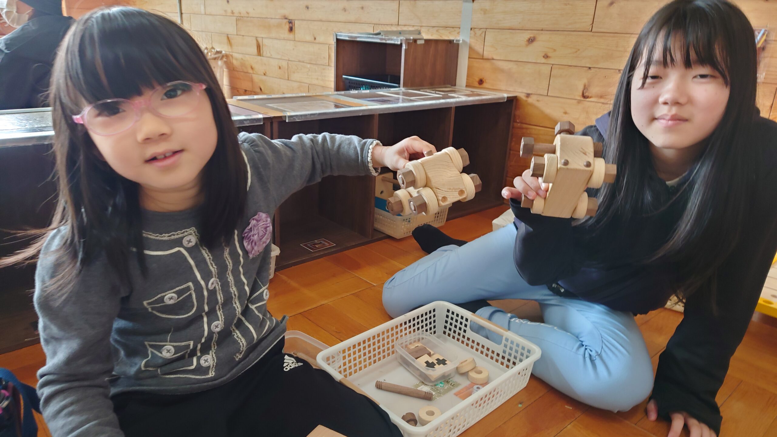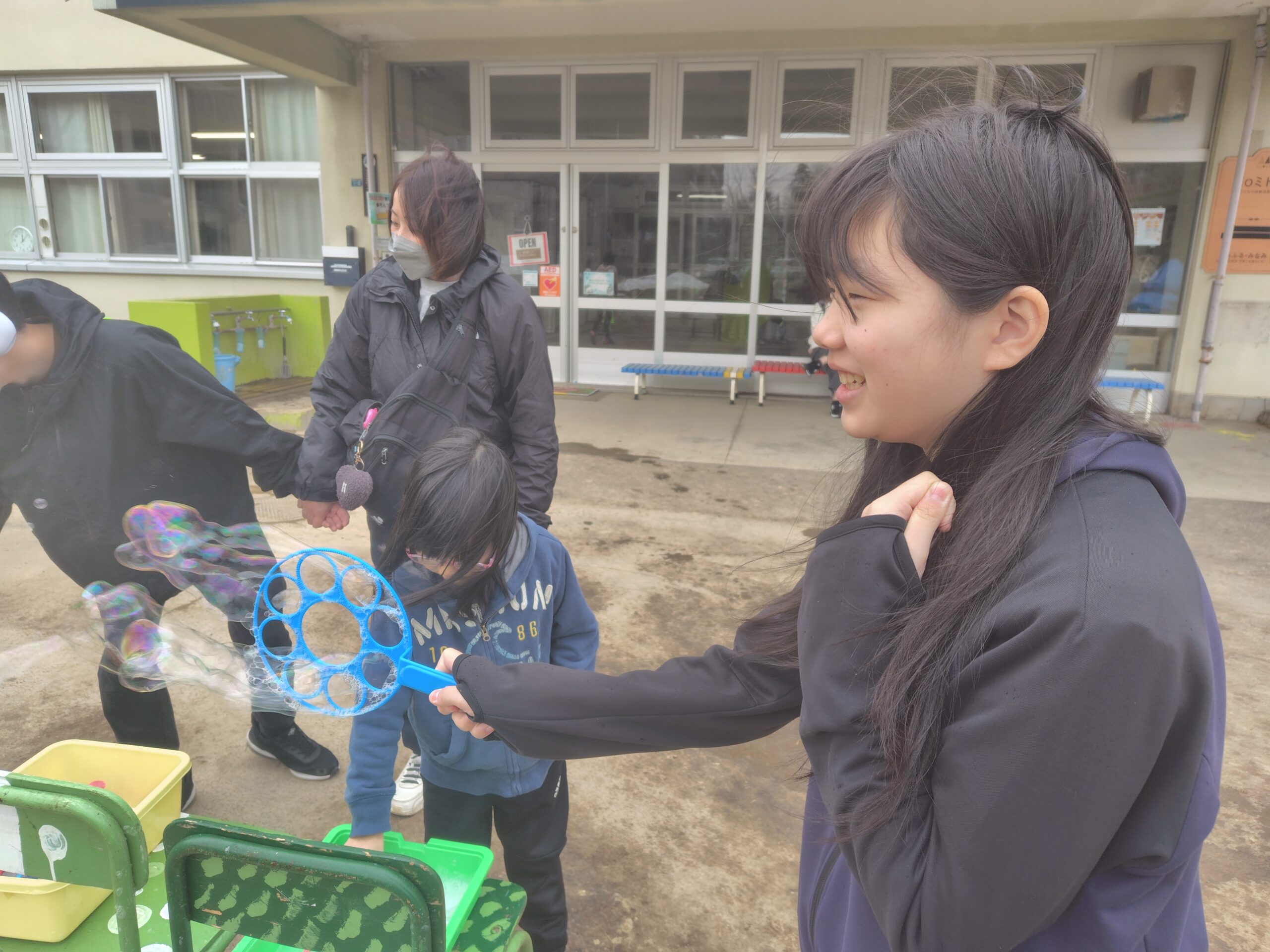 教室で木のおもちゃ、外でシャボン玉で遊んだり